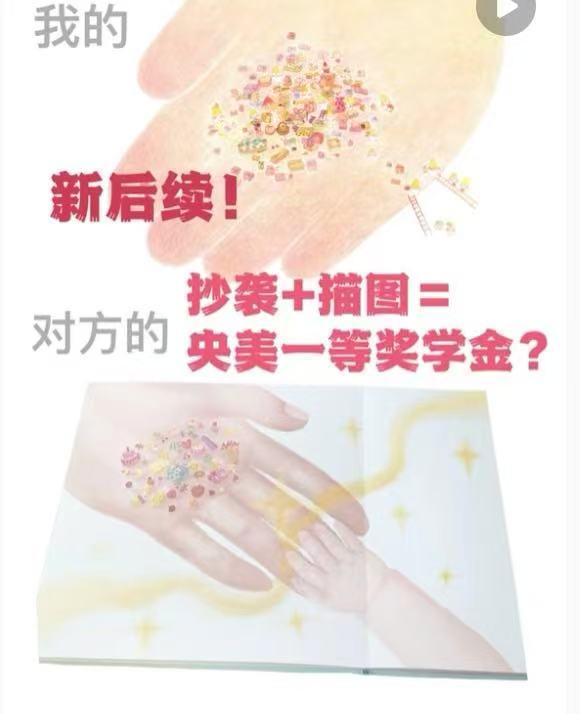 近日,一名四川美术学院油画系研二学生发帖称,其作品或被中央美术学院的一名学生抄袭,该名涉嫌抄袭的学生还获得了学校的一等奖学金。发帖者表示,今年7月,自己找到涉嫌抄袭的同学所在的中央美术学院城市设计学院的任课老师反映情况,老师答应修改该学生的分数,该学生也向其道歉,并且获得了谅解。但事情并未告一段落,该学生后来凭借抄袭作品获得了一等奖学金,这个结果令其非常气愤。11月7日,发帖者称,自己已向中央美术学院有关部门实名举报,正耐心等待答复。